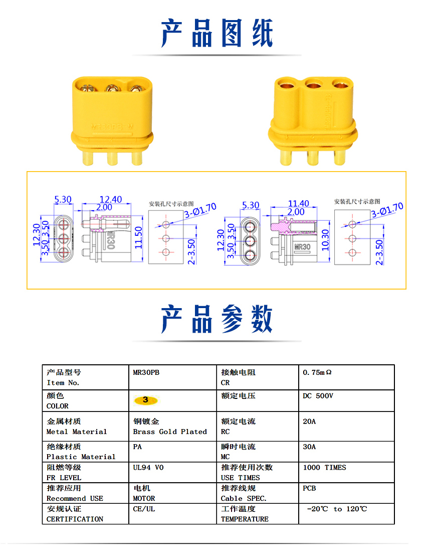 新款 Amass 正廠 MR60PW-M 航模三芯動力電池航空插頭(1對裝)