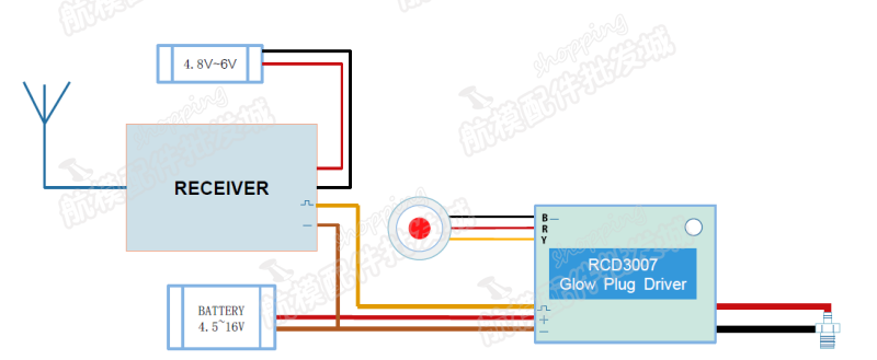 1、和接收機共用同一組電源, 這種模式適合單缸發動機,但由於接收機的限制,只能使用4.8V~6V的電池組。