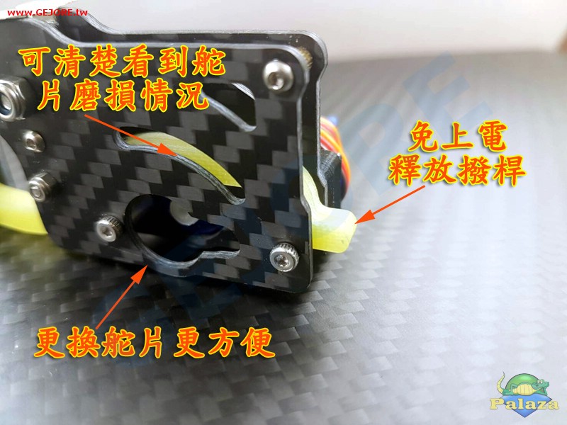 在舵機固定方面,增加了一個塑料固定座,讓舵機更加緊固。舵片縮短為 13mm,力距更大,相對負重能力也增加了!!