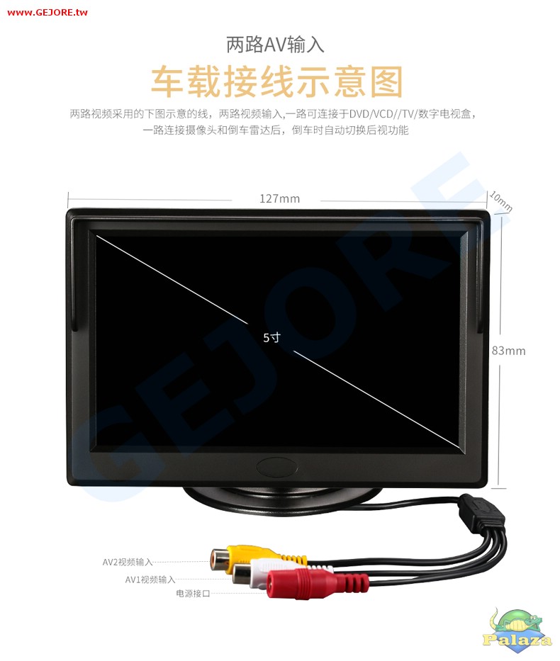 2。顯示屏:5英吋TFT-LCD(4:3) 數字屏分辨率:800X480。輸入電壓:DC12V 。 功率消耗:&le。1.1W