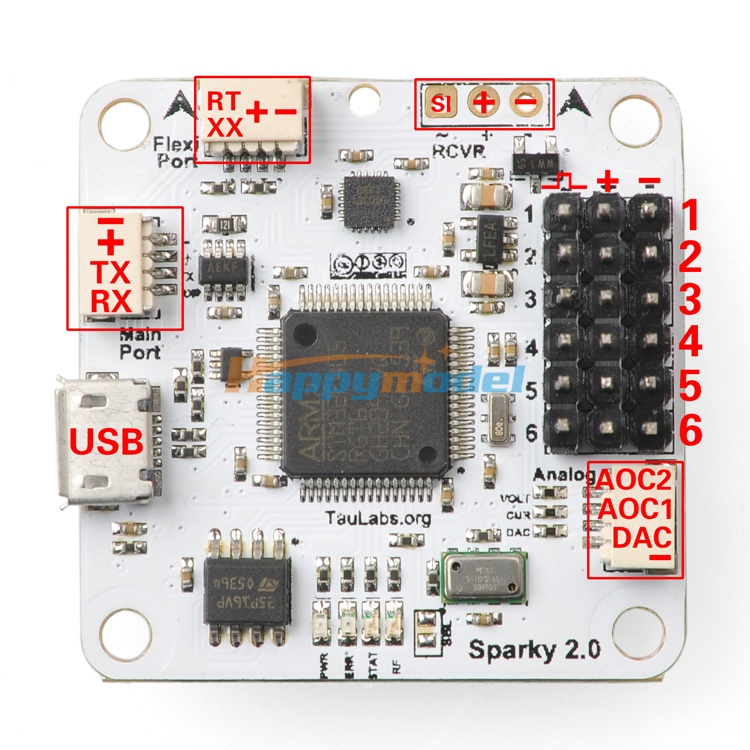 Top connectors:Main Port: USART1. Capable of Telemetry, GPS, DSM, Debug, ComBridge, MavLink, HOTT, FrSky Sensor, Lighttelemetry, PicoC