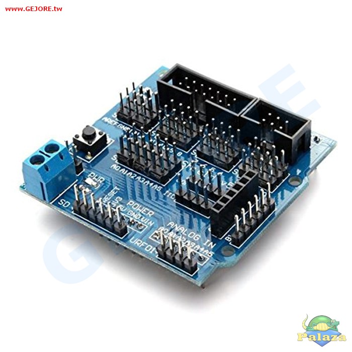 GR9300-10UNO Sensor Shield V5.0 傳感器擴展板,仍才採用疊層設計,主板不僅將 Uno的全部數字與模擬接口以舵機線序形式擴展出來,